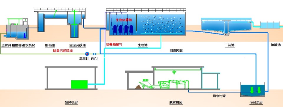 全過程除臭是一種應(yīng)用于污水處理廠的原位減臭技術(shù),通過在污水處理廠生物池內(nèi)設(shè)置培養(yǎng)箱,利用生物填料及活性污泥混合液促進(jìn)除臭微生物的生長、增殖,最后將二沉池的活性污泥按一定比例回流到污水廠進(jìn)水端,利用除臭微生物對(duì)污水中的惡臭物質(zhì)進(jìn)行吸附和生物降解,去除部分惡臭物質(zhì),實(shí)現(xiàn)污水廠惡臭的全過程控制。